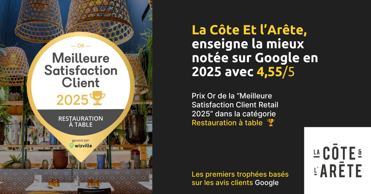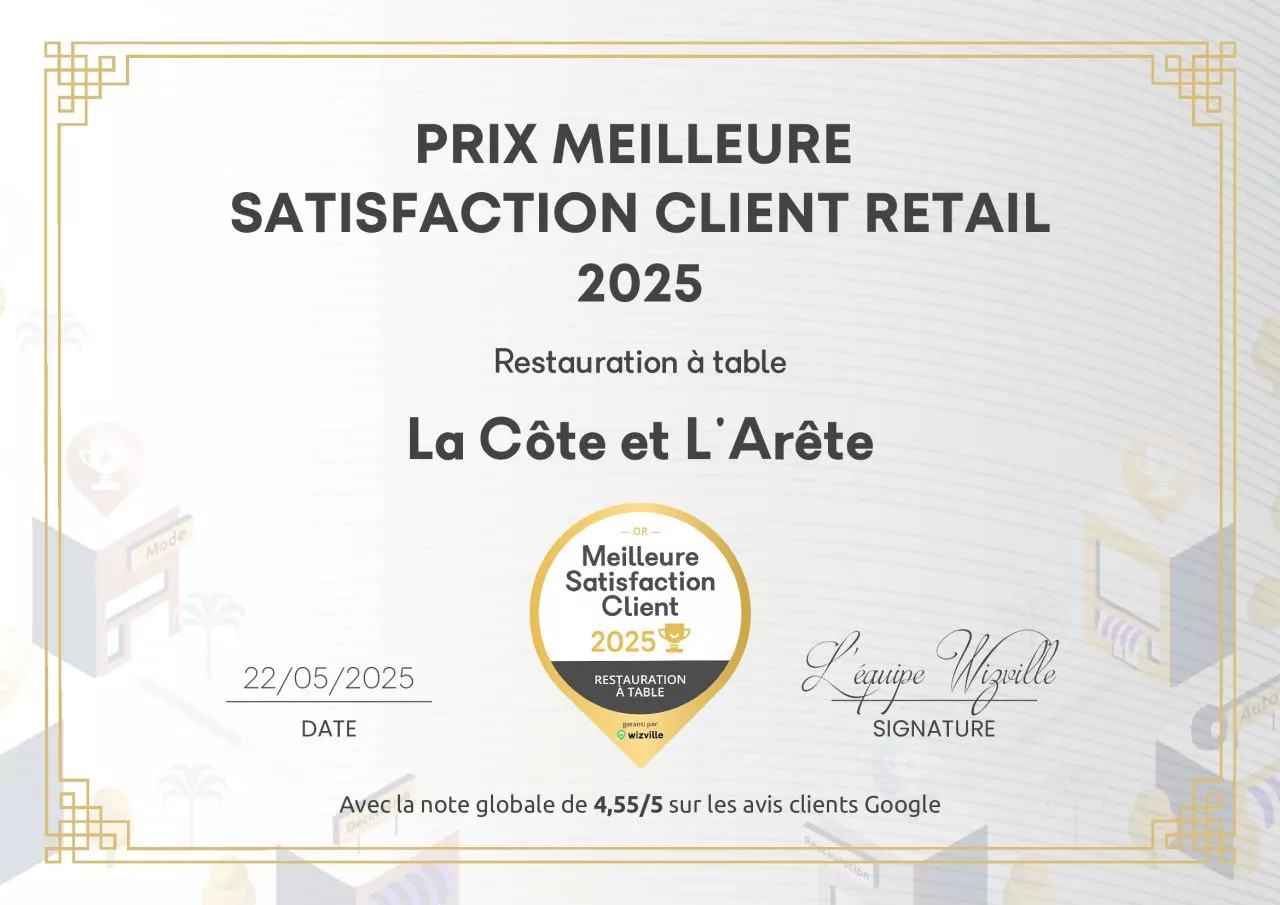 Une victoire signée par nos clients ! La côte & l’arête remporte fièrement le Prix OR de la Meilleure Satisfaction Client Retail 2025, dans la catégorie restauration à table, avec une note remarquable de 4,55/5 sur Google.